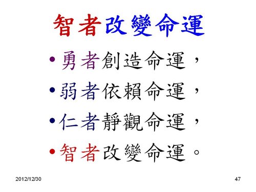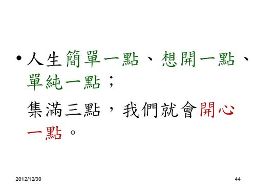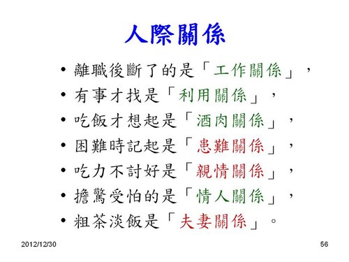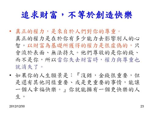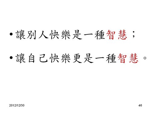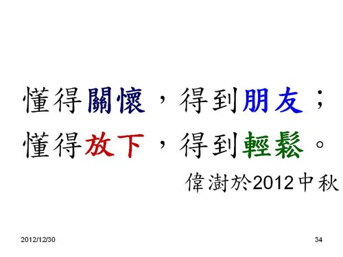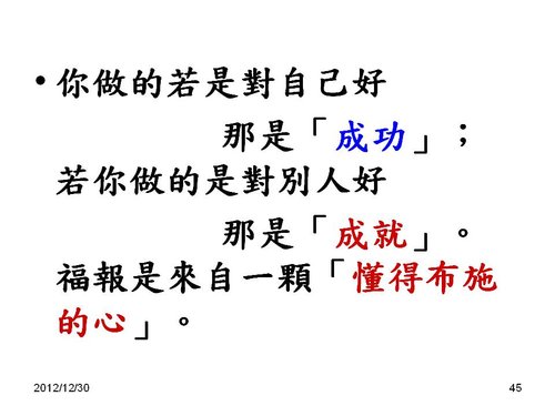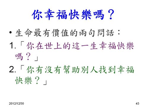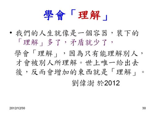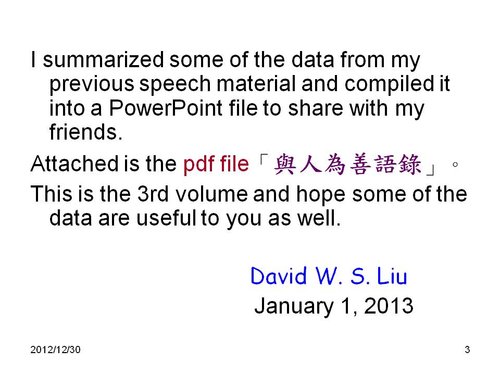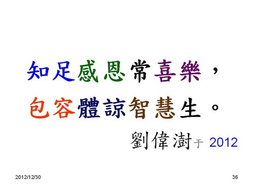 劉老師:感謝分享,和2013年新年的祝福感恩! 也祝福您2013年闔家平安,快樂,幸福. 學生 林兆應敬上2013.1.2