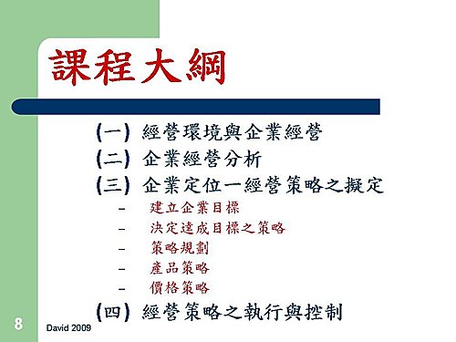 l 環境分析: 科技層面、政府層面、經濟層面、文化層面、人口層面。