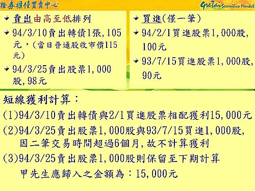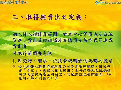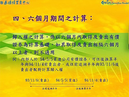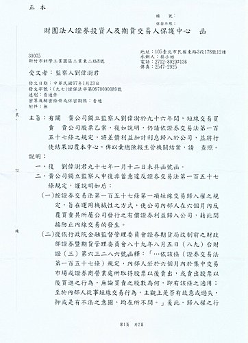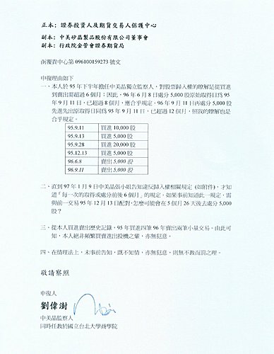 一、本人於95年下半年擔任中美晶獨立監察人,對股票歸入權的瞭解是從買進到賣出需超過6個月;因此,96年6月8日處分5,000股原始取得日為95年9月11日,已超過8個月,應合乎規定。96年9月11日再處分5,000股先進先出原取得日同為95年9月11日,已超過12個月,照我的瞭解也是合乎規定。