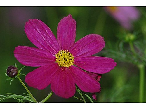 3. 花頂生或腋生,花莖細長,舌狀花瓣, 8片,中心筒狀呈黃色,花形有單辦、重辦,花色有白、黃、桃紅、紫紅等色。