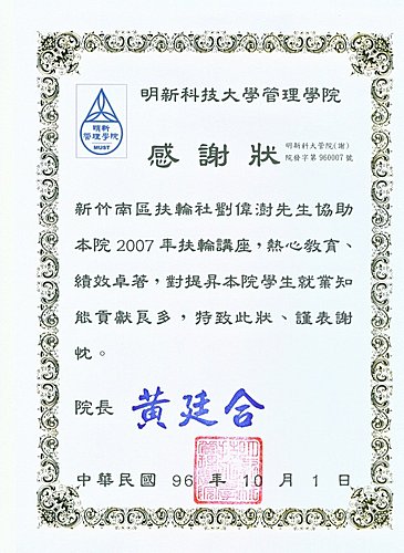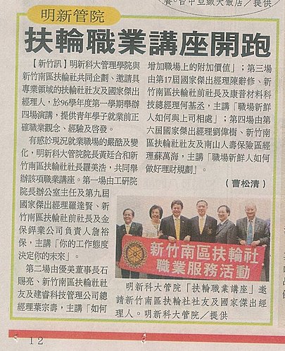再次致誠感謝你的協力及幫忙,也非常感謝新竹南區扶輪社羅社長之鼎力協助、規劃及眾主講者之蒞校演講,得以順利舉行共四場此深具教育意義之職業講座,提供莘莘學子們經驗之啟迪,是一場非常成功的演講,最後敬祝