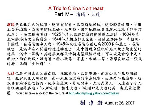 瀋陽是東北最大的城市,遼寧省省會。西漢時稱侯城,遼金時置沈州,並用土夯築城牆,為瀋陽建城之始。元代時,因其地理位置在瀋水之陽(即渾河北岸),而改稱瀋陽路。1625年清太祖將都城從遼陽遷至瀋陽,1634年清太宗將瀋陽改名為盛京,1644年清朝遷都北京後,瀋陽成為陪都,清朝統一中國後,在瀋陽設奉天府,1945年恢復瀋陽名稱已有2000多年歷史瀋陽故宮,是滿清在入關前所建造的皇宮,是中國現今僅次於北京故宮最完整的建築,滿清一條街,其建築大都依清朝建築風格而建,可以說是古味十足,而街上的古玩城,販賣著一些小玩意、字畫、古玩....等。,張學良故居-張氏帥府,又稱〝少帥府〞。
