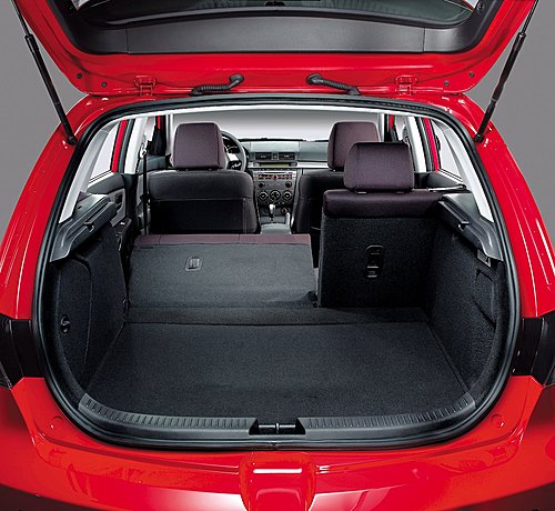 由於避震彈簧設置在車底板下方,使得Mazda3的兩輪拱間的距離為本級距中最長的車種,達1050mm,也使它的行李廂區成為同級車種內最寬者之一,而且底板及兩側也均勻平坦。同時車後椅背之折疊方式為60比40之比例設計,能同時向前折疊或單獨形成一個平坦、延伸式的行李廂表面。Mazda3 Sport的行李區擁有前所未見的運用彈性,車底板下設有隱藏式副行李箱,可以隱密儲放貴重物件,而且後障板更可增加私密性。此外,車底板又分成前後兩截(前端及後端),前端底板可固定在後座後方的輪拱上,而在底板及置物架中間的高度處形成置物空間。同時,後端底板部分也可直立而形成隔板,以分置不同型式的行李(例如汙髒物件及乾淨行李)。將前底板作為置物架而後底板部分直立放置時,兩者中間可形成儲藏間,這即使是打開車尾門也無法看到,所以可用來儲放貴重物品而不會顯露出來。五門後座有乘客下,其行李廂容積為300公升(DIN),將上述兩截放平並使後椅背向前傾後,行李廂容積更可達635公升。