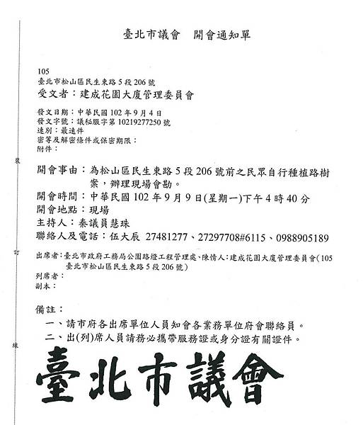 今天大樓管理員告知,貴處 甘先生要求我們花了NT$42,000 (桂樹,3.5公尺高,約40年) 種於民生東路五段的「行道樹」移除,本大樓住戶聞之非常氣憤,群情激憤。