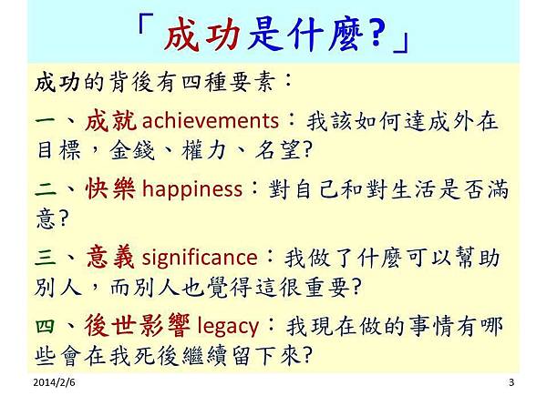 從小個性就好強,總是在爭全班第一名,全校第一名,小學學測考全台北市第一名,預官考全國第二名,……,三十歲不到成為外商公司亞太地區最年輕的協理,當選全國最年輕的國家傑出經理人,2009, 2010 一年近百場的演講,……。靜下心來,這輩子到底我是成功了嗎? 成功又是什麼呢?
