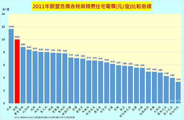 接著縱向檢視台灣歷年電價資料,1981年電價是2.73元/度,台灣電價2012年則是約2.76元/度,民國71年到90年,因為3部核能電廠的6部機組都加入運轉,20年間調降電價11次。由於92年國際燃料價格開始大幅上漲,我國進口煤炭地區主要地區為澳洲及印尼(約各佔4成),近10年國際燃煤價格持續上漲。據經濟部資料指出:民國92年至100年,油及燃煤價格皆暴漲176%、天然氣也上漲63%。唯礙於民生壓力,我國10年來電價只調漲4次,平均電價僅上調26%。Source: 電價上漲誰之過 - 國家政策研究基金會