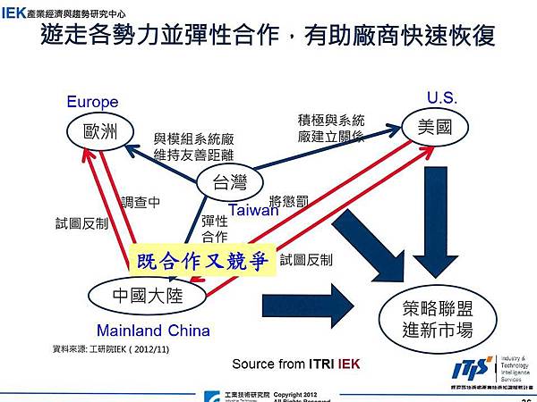 In the whole supply chain, Taiwanese cell manufacturers play an important role in the world. Cells made in Taiwan are known for high quality, competitive prices and are export to the European market, Japanese market and US market. Taiwanese solar cell manufacturers are leaders in high efficiency, low breakage and much better quality compared with cells made in China. China’s so called vertical integration manufacturers use Taiwanese cells assembled with modules and exported to both the US market as well as European market. US and EU solar energy systems installed should thank to high quality cell made in Taiwan. In the whole industry, Taiwanese manufacturers maintain vital link and a balanced relationship among competitive chain of the U.S. Europe and China (see graph below from ITRI IEK).