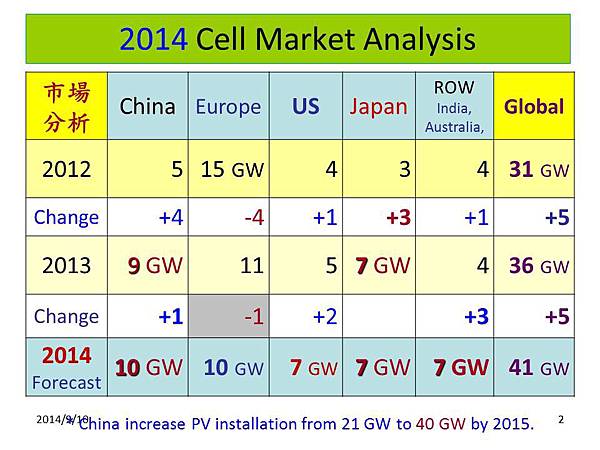 The solar industry continues to grow at a 20% to 30% growth rate every year. The 2014 forecast is about 41 GW of which China and Europe make up around 10 GW, while US, Japan and the rest of the world contribute about 7 GW, for details please refer to following table.