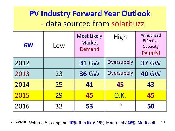 The over-supply situation lasted for three years from 2011, 2012 to 2013. The whole supply chain market selling price dropped dramatically during this period of time. All manufacturers are losing money. The over-supply situation will improve in 2014 and hopefully supply/demand will be balanced in the year of 2015 if there is no more new capacity added to the present market.