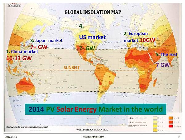 From following the SOLAREX global map, China is projected to add 10 to 13 GW in 2014 and will be the largest PV market in the world, while the European market at 10 GW ranks second, Japanese solar energy use is growing very fast and is projected to be larger than 7 GW in this year, ranking the third while the US market will be less than 7 GW, or fourth in the world.