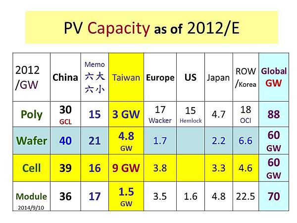 As you can see from the capacity data below, the PV industry supply chain from upper stream poly and wafer to lower stream of cell and module are experiencing over capacity. The whole world demand is around 40 GW, while poly capacity is 80 GW, wafer and cell capacity is 60 GW and module capacity is 70 GW. The over-capacity mainly comes from China; China’s capacity alone can supply the whole world market demand.