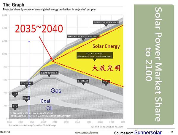 According to a recent report from Worldwatch, the power generated from solar energy is about 1/3 of all renewable energy sources. There are several countries such as Australia, Brazil, Demark, Italy and Germany, where the cost per watt from solar energy is lower than traditional power plants now. Germany’s Energy Consulting Committee claimed that 25% of electric power will come from solar energy by year 2050, while the Australian government projected by 2040, solar energy will be the lowest cost clean energy in the world. UN IPCC (Intergovernmental Panel on Climate Change) published on April 13, 2014 urging all countries in the world to use renewable energy especially solar energy to slow down global warming.