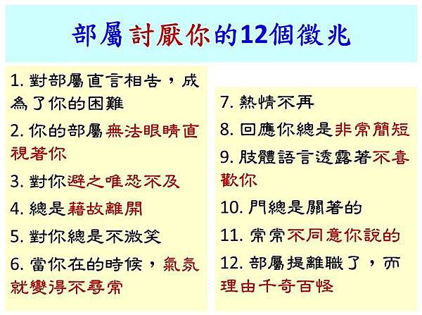 職場專家與《Tame Your Terrible Office Tyrant》的作者Lynn Taylor談到,你的部屬只會私底下地談論你有多麼地討人厭,因為他們還想保住飯碗。但如果你能早點發現這些被討厭的訊號,就能快點作出反應,然後改進自己的行為,重新獲得部屬的信任。JACQUELYN SMITH在《Inc.》雜誌網站上,提到了14個,你可能已經被部屬狠狠討厭的徵兆,早點察覺它,就能重新獲得部屬的尊重!