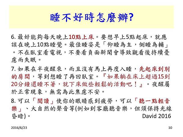 - 9. 如果太早醒來,建議延後入睡時間,可從起床時間往前推6~7.5小時入睡,可慢慢以每天半小時為單位延後躺床的時間,逐量調整。